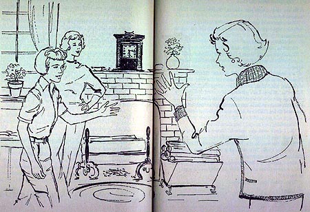 The dust jacket featured the art shown at left by Polly Bolian which was also the same art used for the frontispiece. The background color of the dust jacket was a yellowish/mustard color. The covers as shown above were grey and the spine was sea green in color. The ribbon holding the Cameo was turquoise and the endpapers featured the same turqoise colored ribbon. The ink-topped pages were turqoise in color to match the ribbon. Shown below are the endpapers and an ad for the cameo editions: