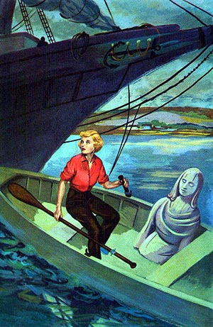 The dust jacket featured the art shown at left by Polly Bolian which was also the same art used for the frontispiece. The background color of the dust jacket was a purple/grey color. The covers as shown above were grey and the spine was greyish-blue in color. The ribbon holding the Cameo was purple and the endpapers featured the same purple colored ribbon. Shown below are the endpapers and an ad for the cameo editions: