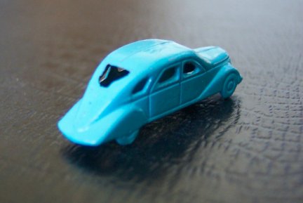The cars for the game were metal for all versions. The playing pieces ranged from thicker round