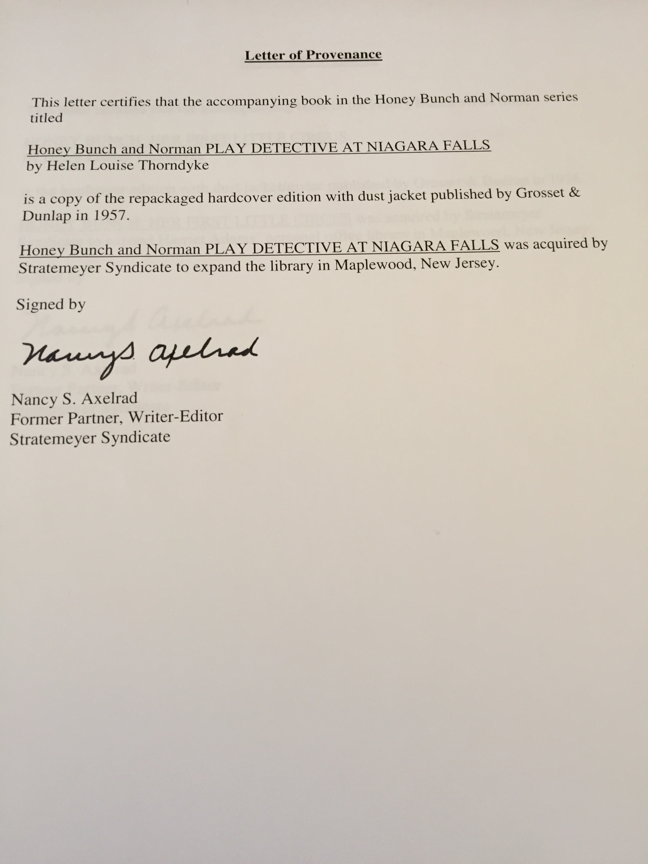 Below are 12 files of original typed manuscripts with Grosset & Dunlap edits - Manuscripts are in a file folder, some have notes/edits as noted below. Manuscripts range from 90 to 100+ pages. What's in each folder is described below. Some folders have more than one copy of a manuscript - only one copy has a signed title page, see individual descriptions below for details.